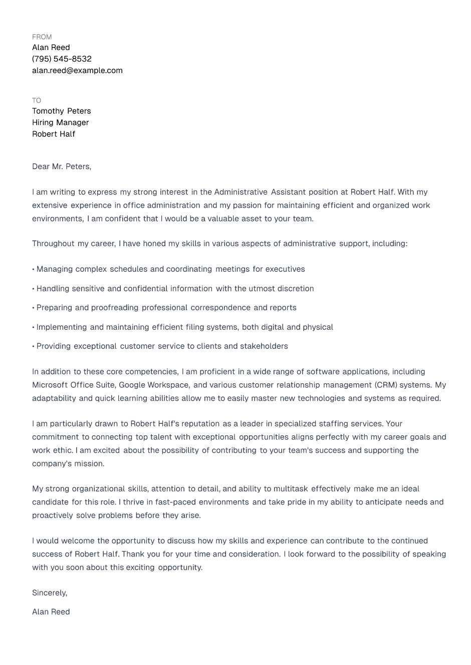 I am writing to express my strong interest in the Administrative Assistant position at Robert Half. With my extensive experience in office administration and my passion for maintaining efficient and organized work environments, I am confident that I would be a valuable asset to your team.