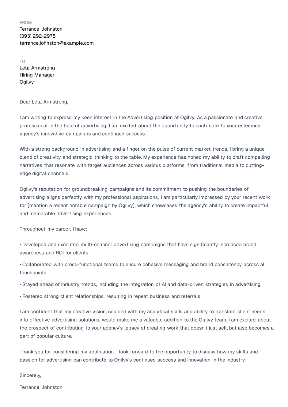 I am confident that my creative vision, coupled with my analytical skills and ability to translate client needs into effective advertising solutions, would make me a valuable addition to the Ogilvy team. I am excited about the prospect of contributing to your agency's legacy of creating work that doesn't just sell, but also becomes a part of popular culture.