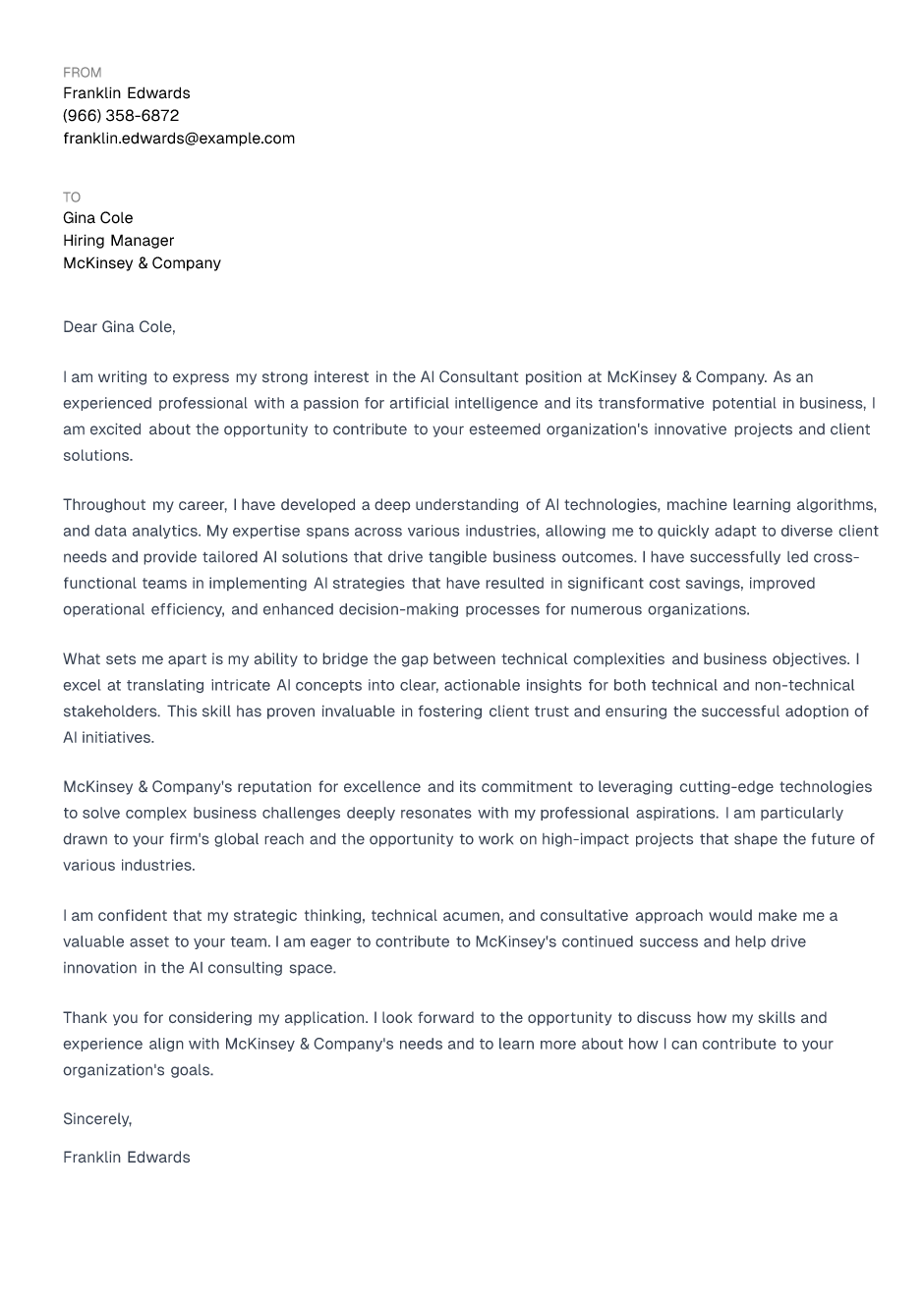 I am confident that my strategic thinking, technical acumen, and consultative approach would make me a valuable asset to your team. I am eager to contribute to McKinsey's continued success and help drive innovation in the AI consulting space.