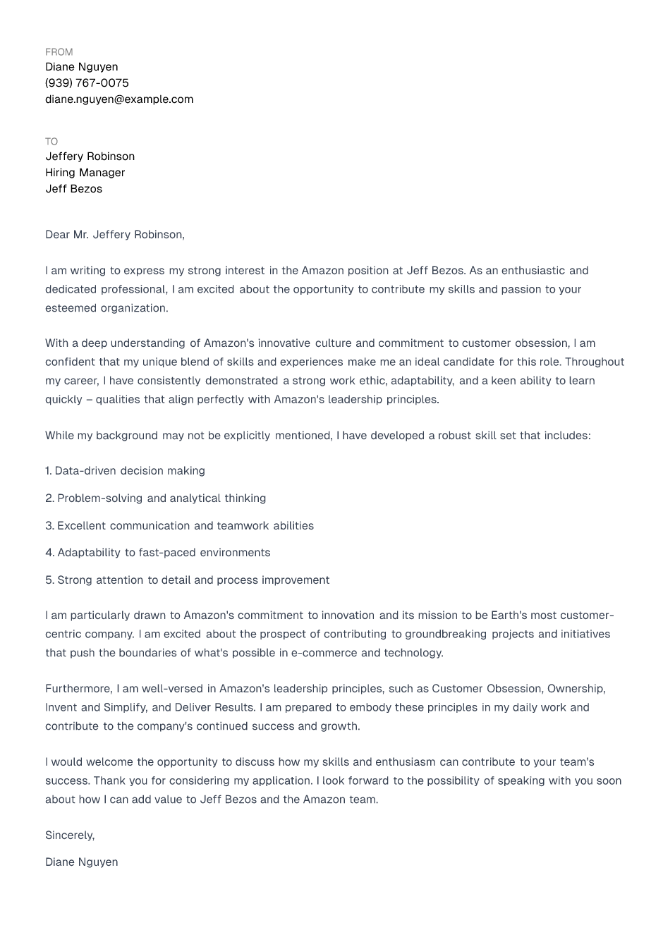 The body of your Amazon cover letter is where you can showcase your qualifications and enthusiasm for the role. This section should highlight your relevant skills, experiences, and achievements that align with Amazon's leadership principles and the specific job requirements.