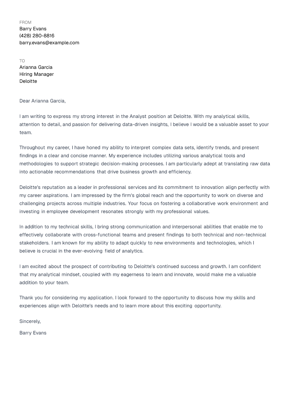 I am writing to express my strong interest in the Analyst position at Deloitte. With my analytical skills, attention to detail, and passion for delivering data-driven insights, I believe I would be a valuable asset to your team.