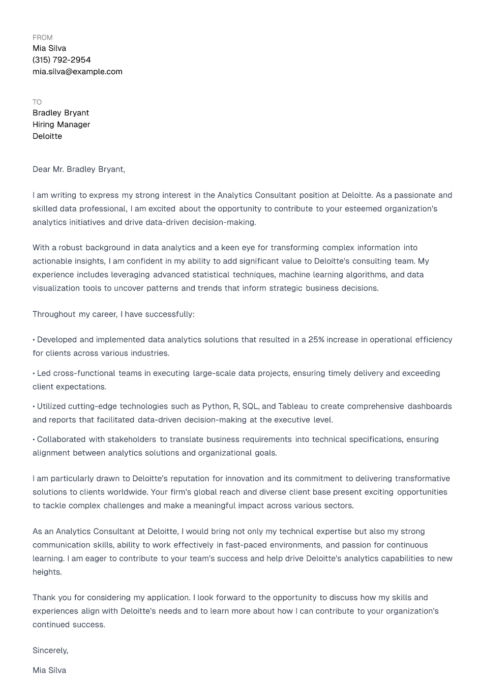 I am writing to express my strong interest in the Analytics Consultant position at Deloitte. As a passionate and skilled data professional, I am excited about the opportunity to contribute to your esteemed organization's analytics initiatives and drive data-driven decision-making.