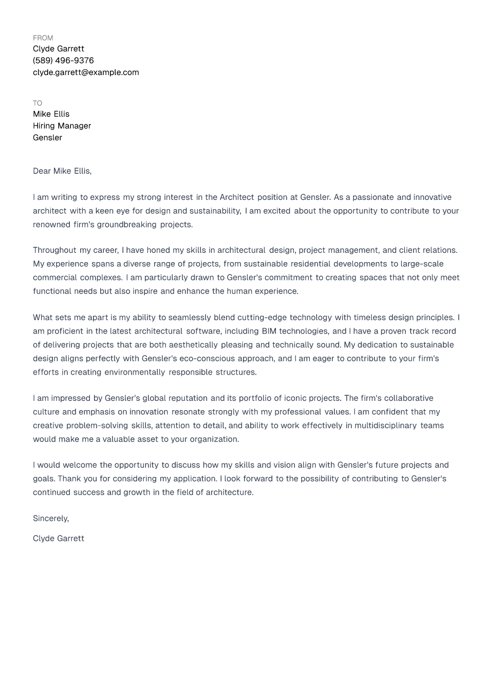 I would welcome the opportunity to discuss how my skills and vision align with Gensler's future projects and goals. Thank you for considering my application. I look forward to the possibility of contributing to Gensler's continued success and growth in the field of architecture.