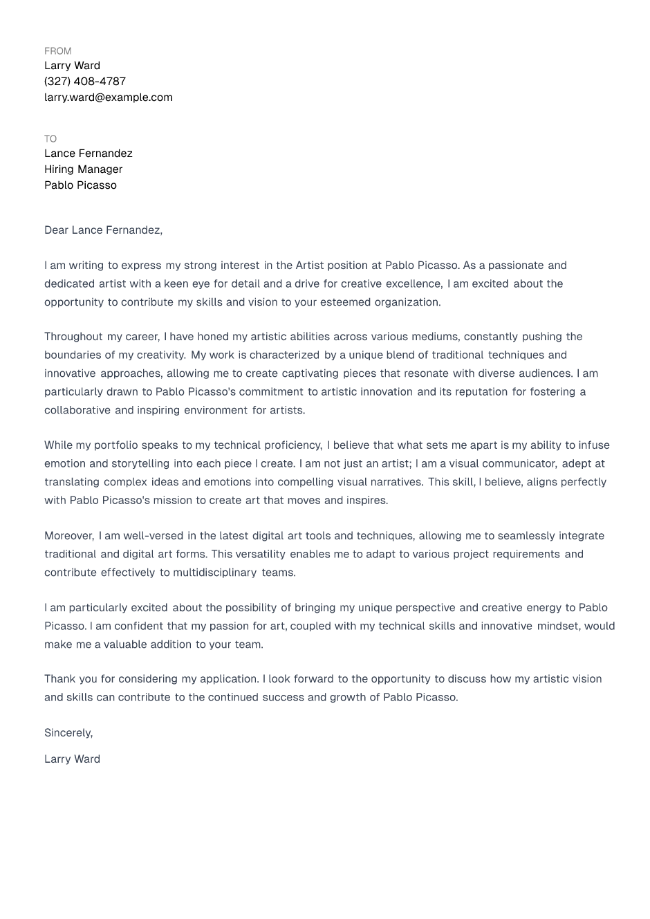 Thank you for considering my application. I look forward to the opportunity to discuss how my artistic vision and skills can contribute to the continued success and growth of Pablo Picasso.