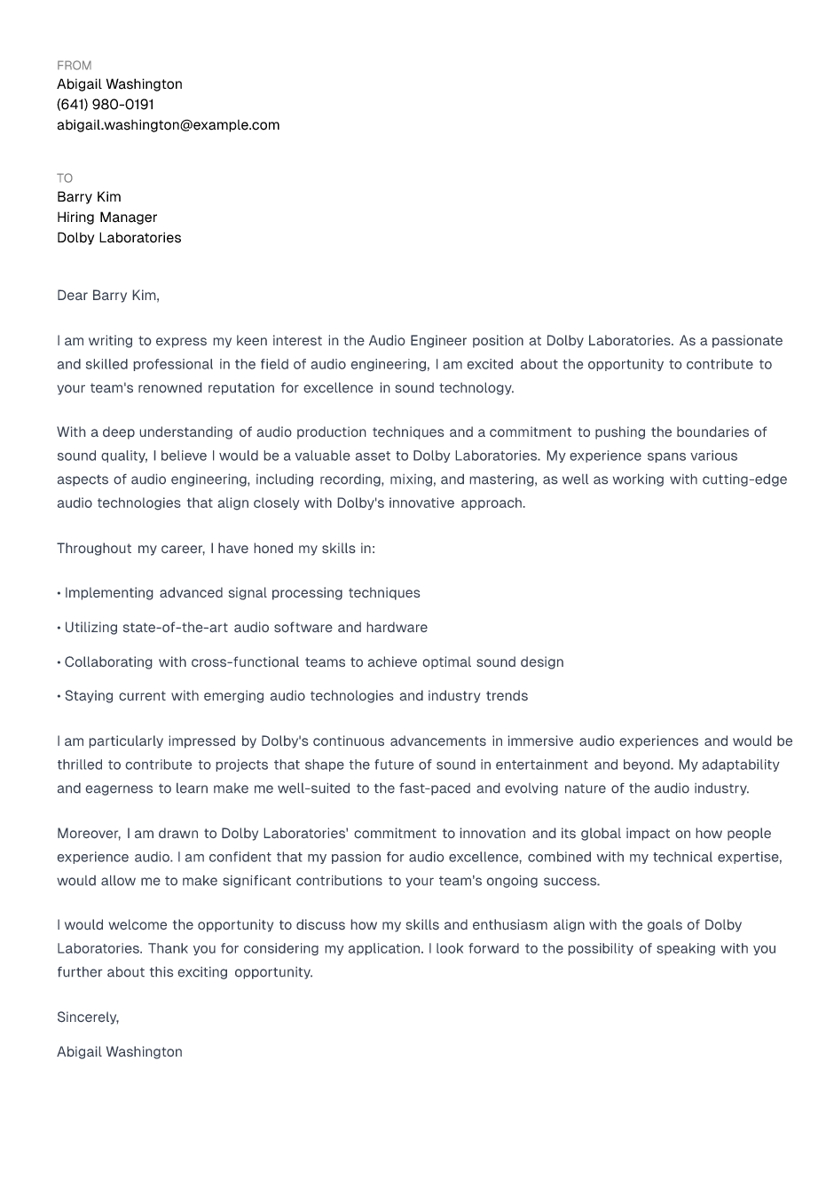 Moreover, I am drawn to Dolby Laboratories' commitment to innovation and its global impact on how people experience audio. I am confident that my passion for audio excellence, combined with my technical expertise, would allow me to make significant contributions to your team's ongoing success.