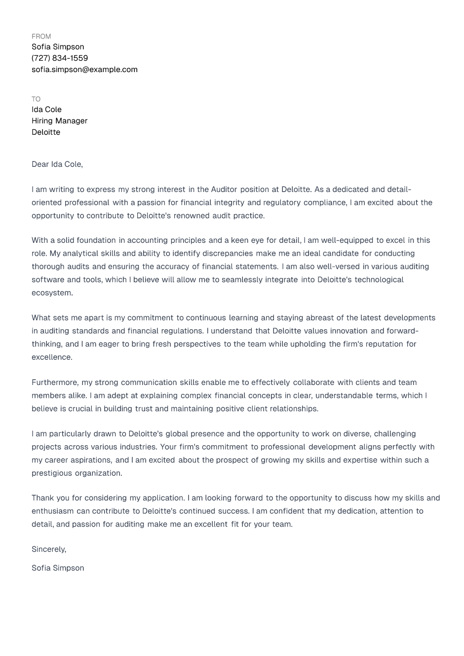 Thank you for considering my application. I am looking forward to the opportunity to discuss how my skills and enthusiasm can contribute to Deloitte's continued success. I am confident that my dedication, attention to detail, and passion for auditing make me an excellent fit for your team.