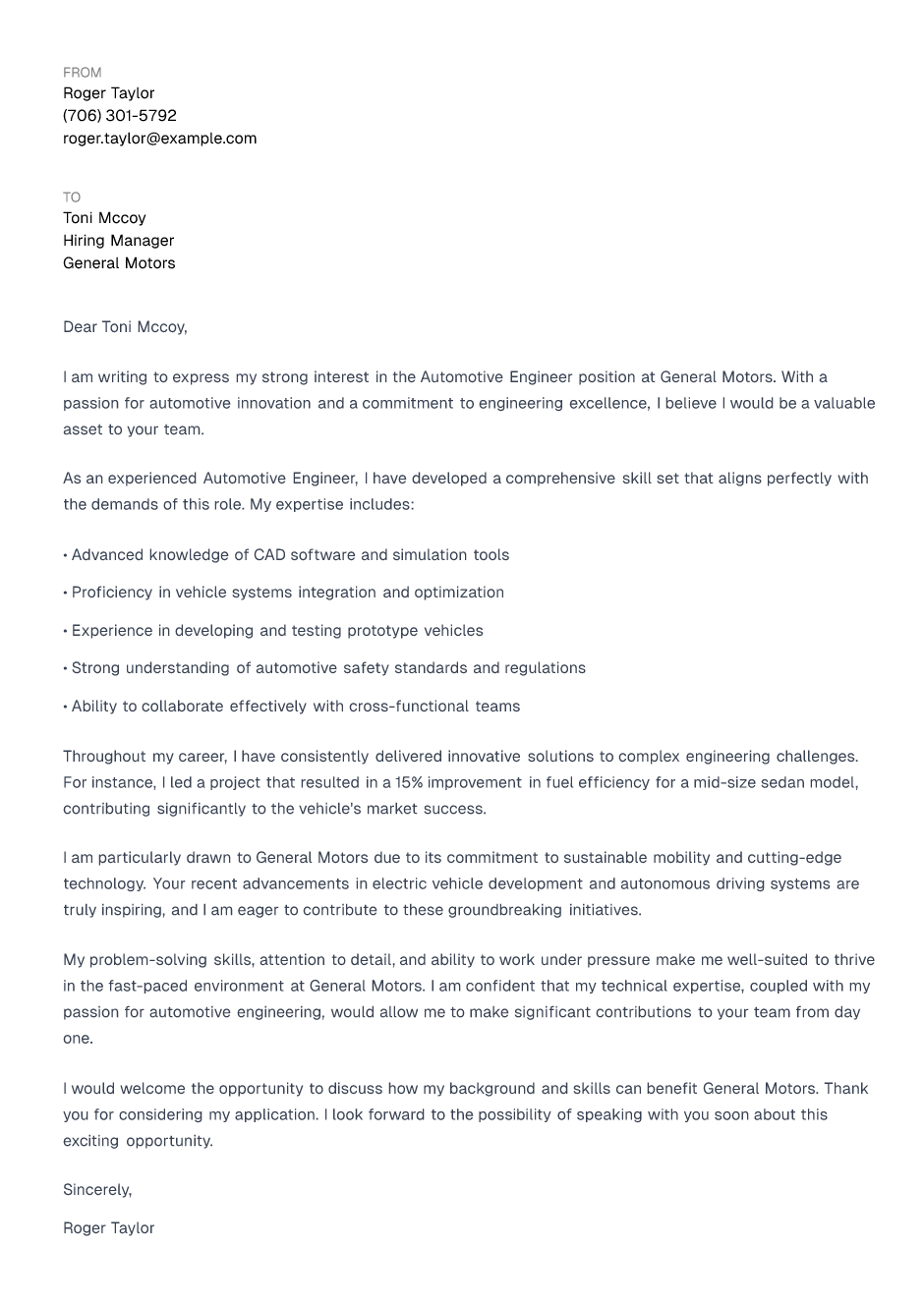 My problem-solving skills, attention to detail, and ability to work under pressure make me well-suited to thrive in the fast-paced environment at General Motors. I am confident that my technical expertise, coupled with my passion for automotive engineering, would allow me to make significant contributions to your team from day one.