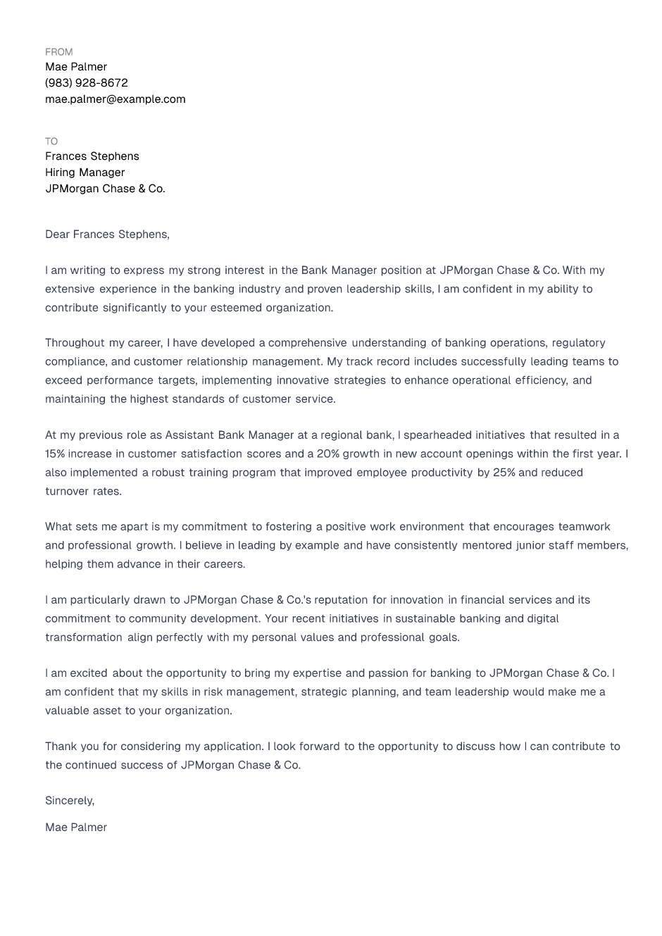 I am excited about the opportunity to bring my expertise and passion for banking to JPMorgan Chase & Co. I am confident that my skills in risk management, strategic planning, and team leadership would make me a valuable asset to your organization.