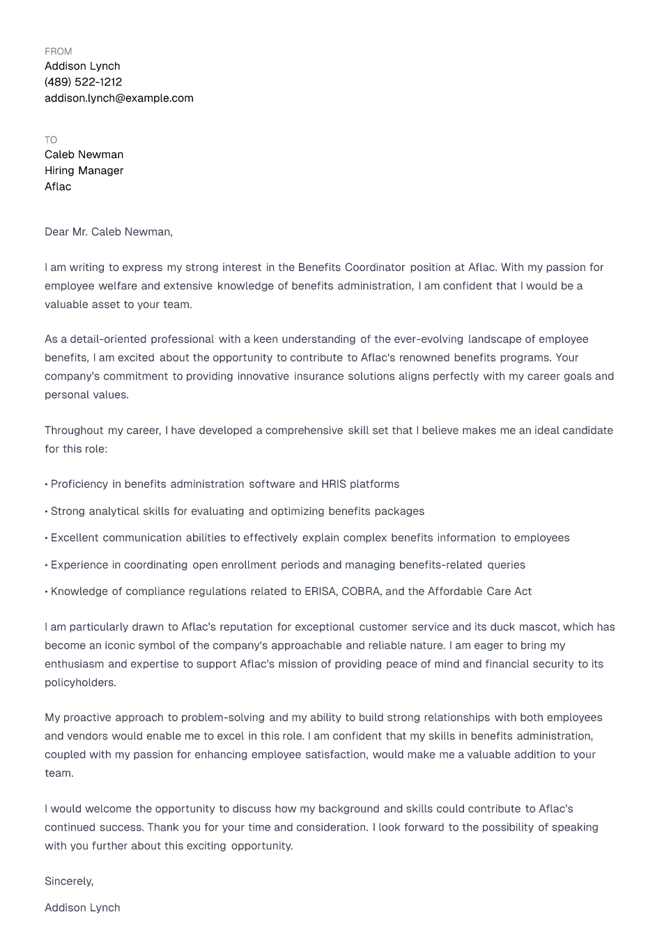 I am writing to express my strong interest in the Benefits Coordinator position at Aflac. With my passion for employee welfare and extensive knowledge of benefits administration, I am confident that I would be a valuable asset to your team.
