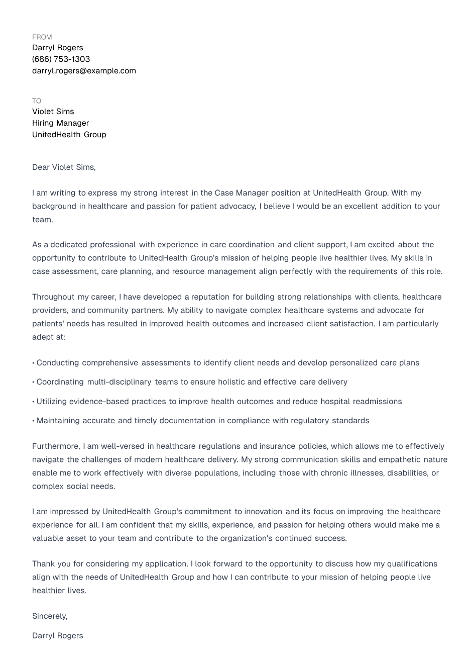 Remember to convey enthusiasm for the position and the organization. Explain why you're passionate about case management and how your goals align with the company's mission or values. This personal touch can help create a connection with the reader and make your application more memorable.