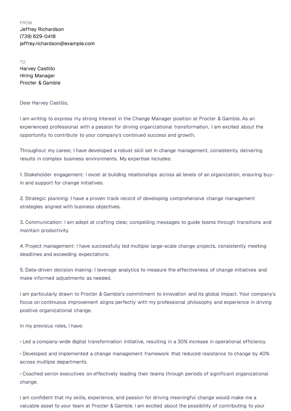 Change Manager Cover Letter Example