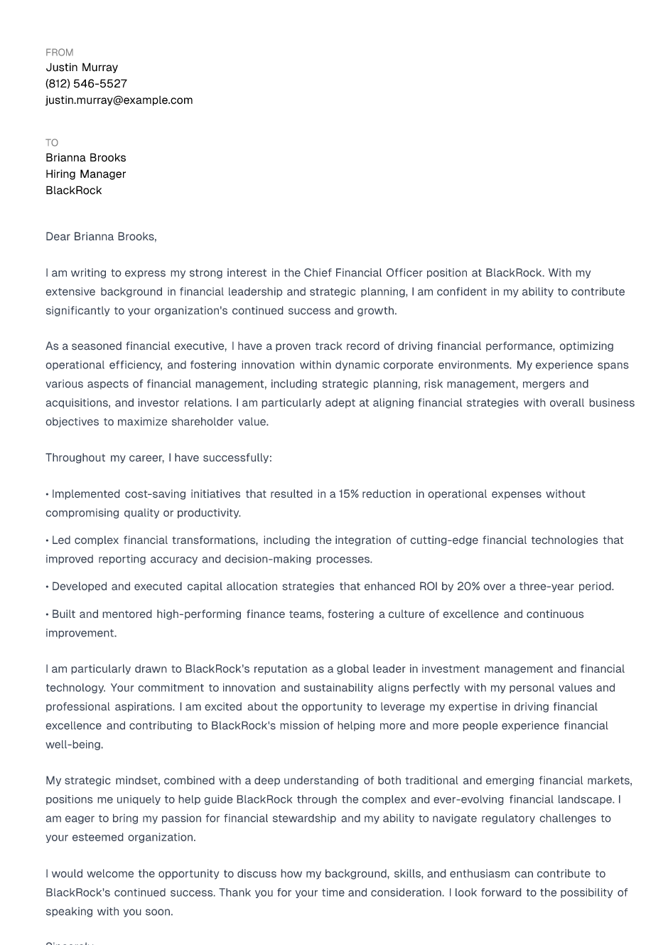 Chief Financial Officer Cover Letter Example