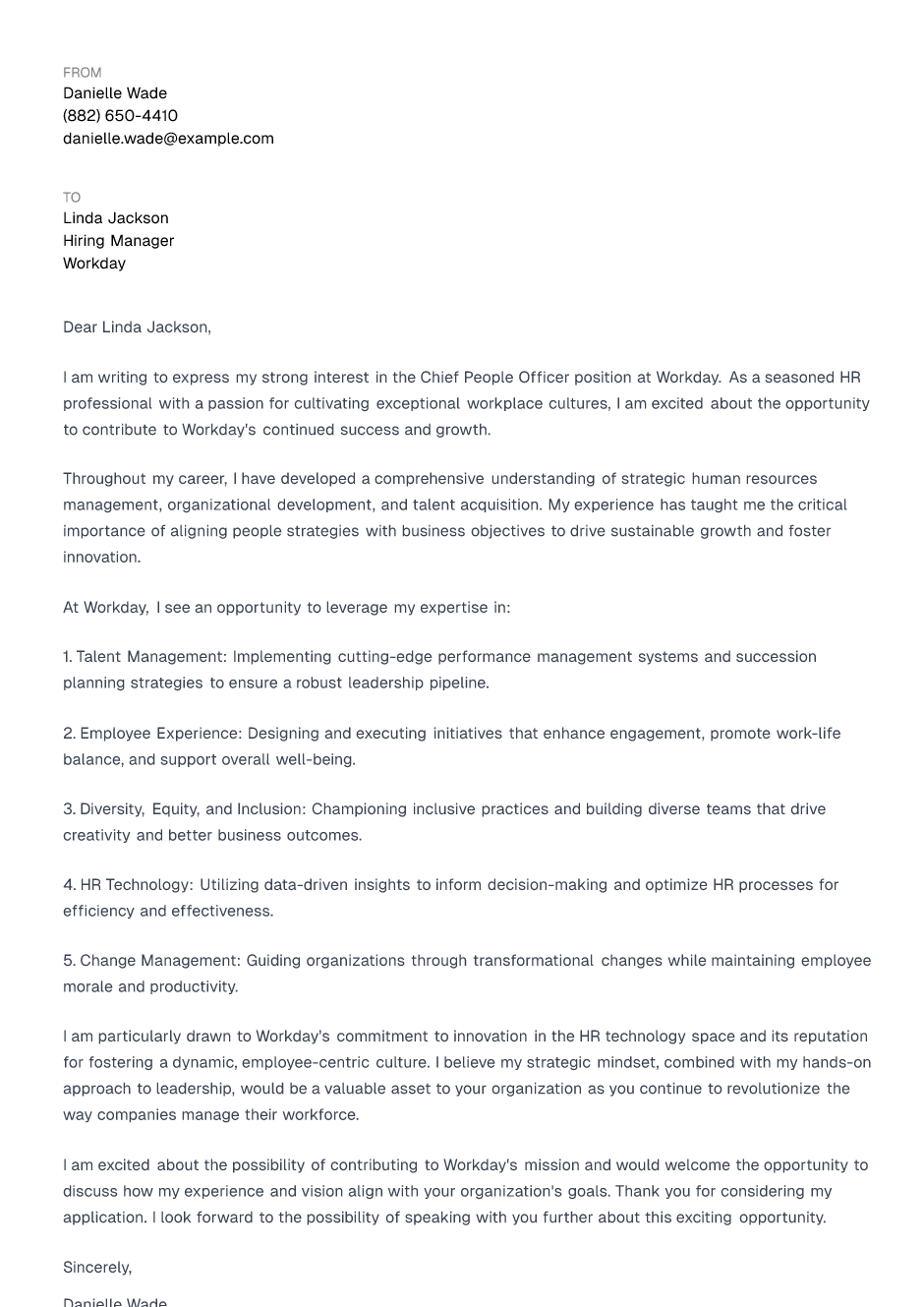 I am writing to express my strong interest in the Chief People Officer position at Workday. As a seasoned HR professional with a passion for cultivating exceptional workplace cultures, I am excited about the opportunity to contribute to Workday's continued success and growth.