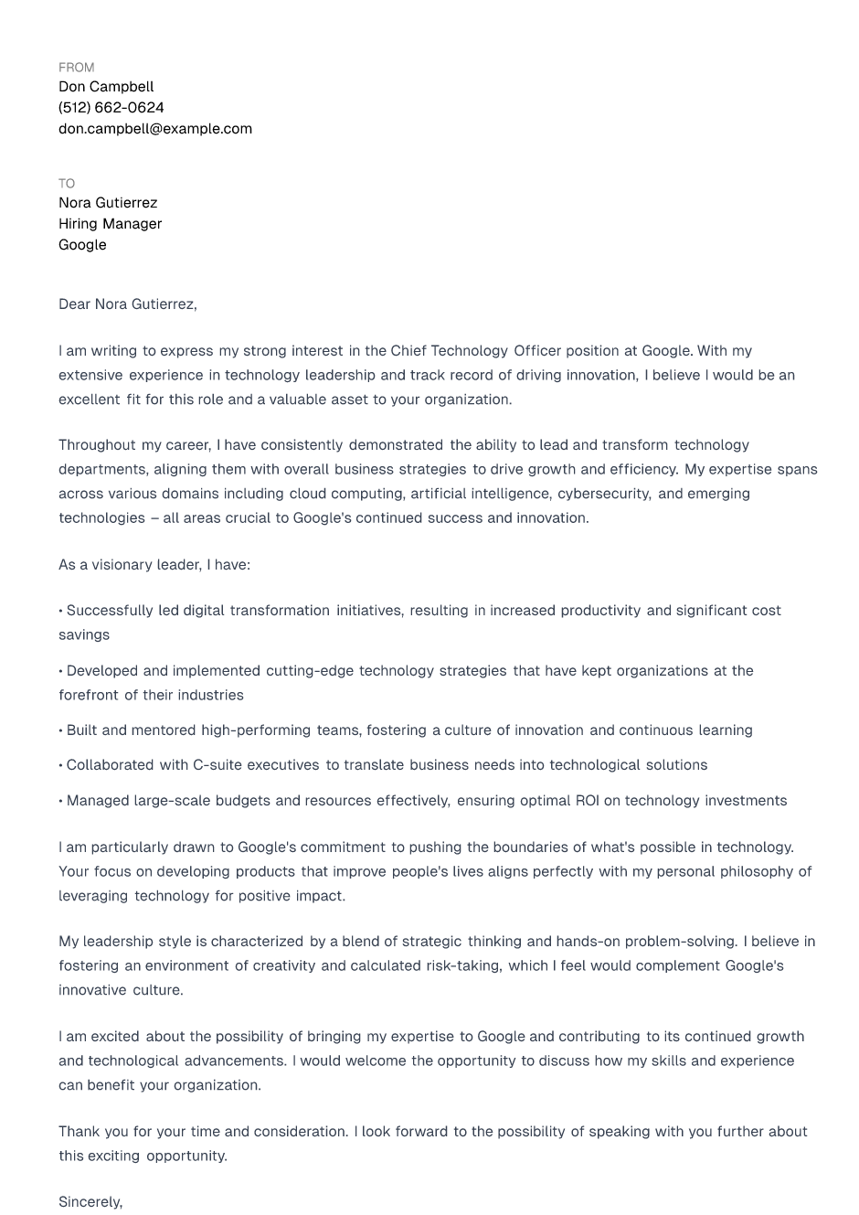 I am writing to express my strong interest in the Chief Technology Officer position at Google. With my extensive experience in technology leadership and track record of driving innovation, I believe I would be an excellent fit for this role and a valuable asset to your organization.