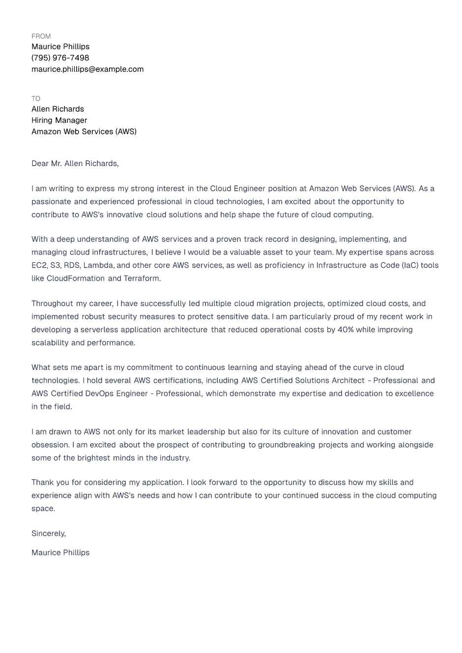 Cloud engineers work with complex systems and need to explain technical ideas clearly. Your cover letter is a perfect place to show that you can do this. It's where you can talk about your experience with cloud platforms, your problem-solving skills, and how you've helped past employers.