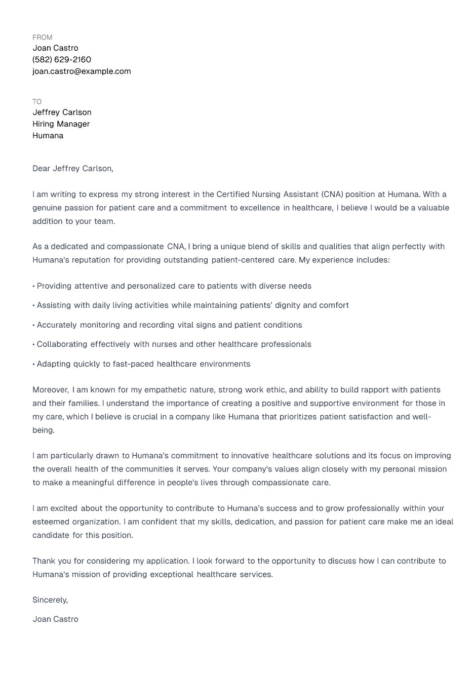 I am writing to express my strong interest in the Certified Nursing Assistant (CNA) position at Humana. With a genuine passion for patient care and a commitment to excellence in healthcare, I believe I would be a valuable addition to your team.