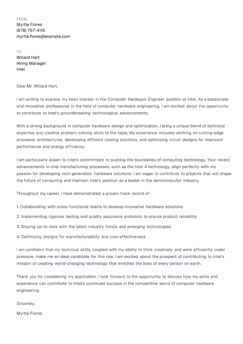 Thank you for considering my application. I look forward to the opportunity to discuss how my skills and experience can contribute to Intel's continued success in the competitive world of computer hardware engineering.
