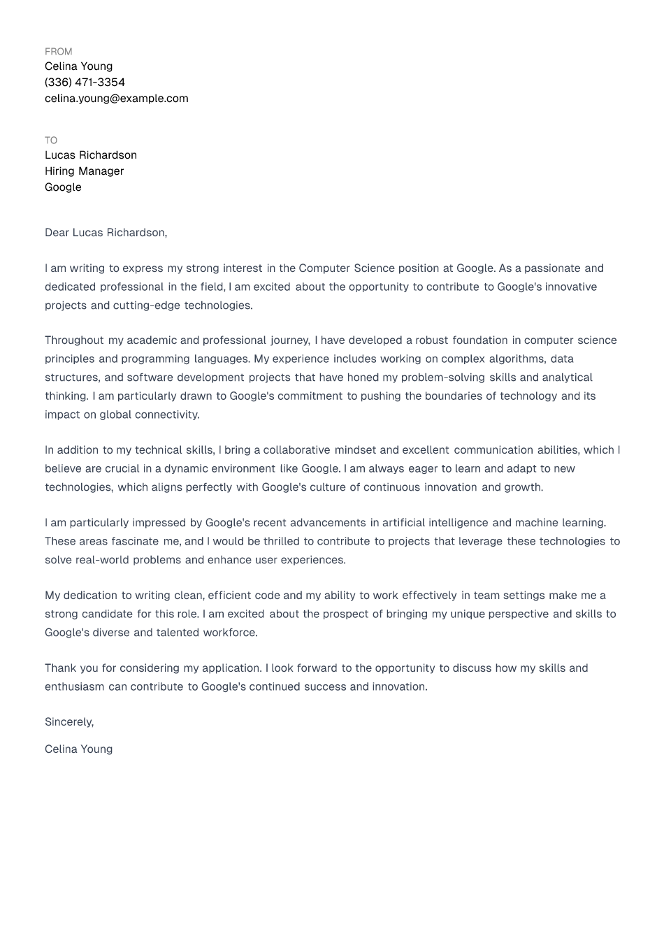 Computer Science Cover Letter Example