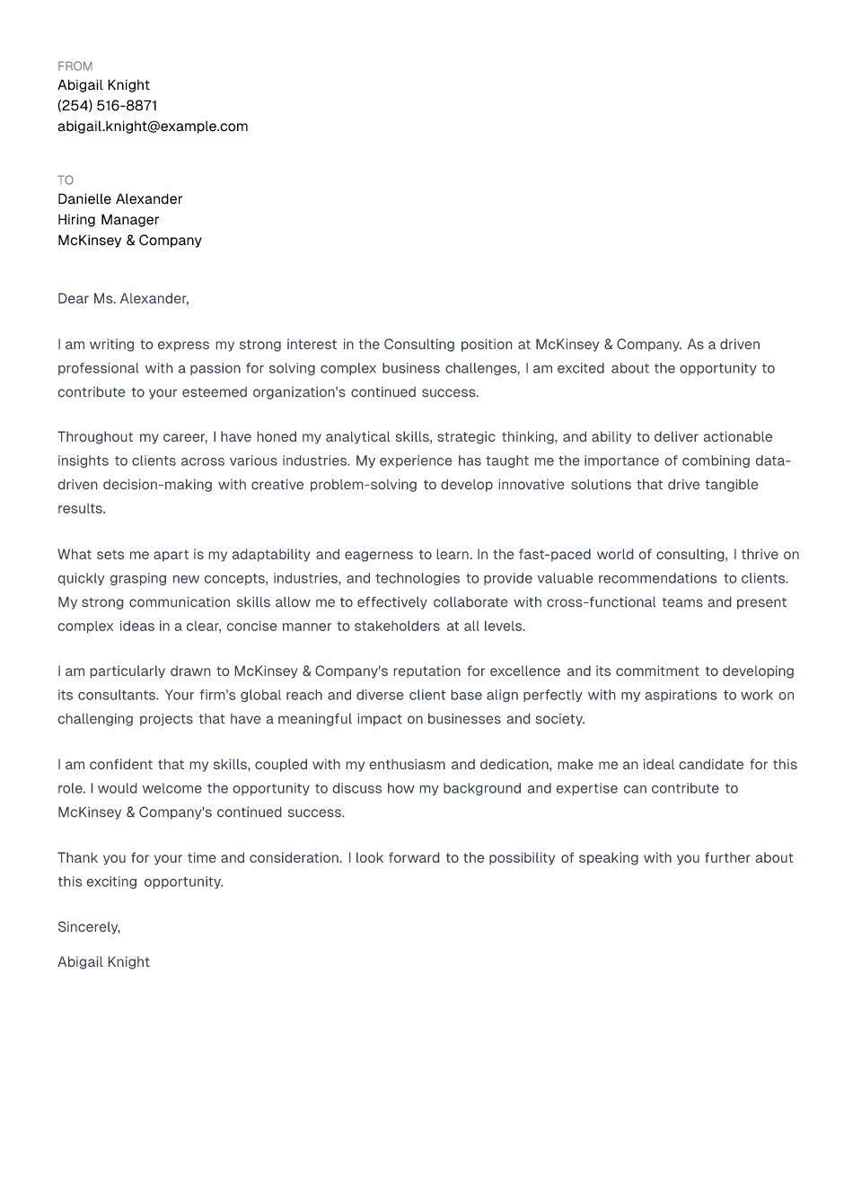 I am writing to express my strong interest in the Consulting position at McKinsey & Company. As a driven professional with a passion for solving complex business challenges, I am excited about the opportunity to contribute to your esteemed organization's continued success.
