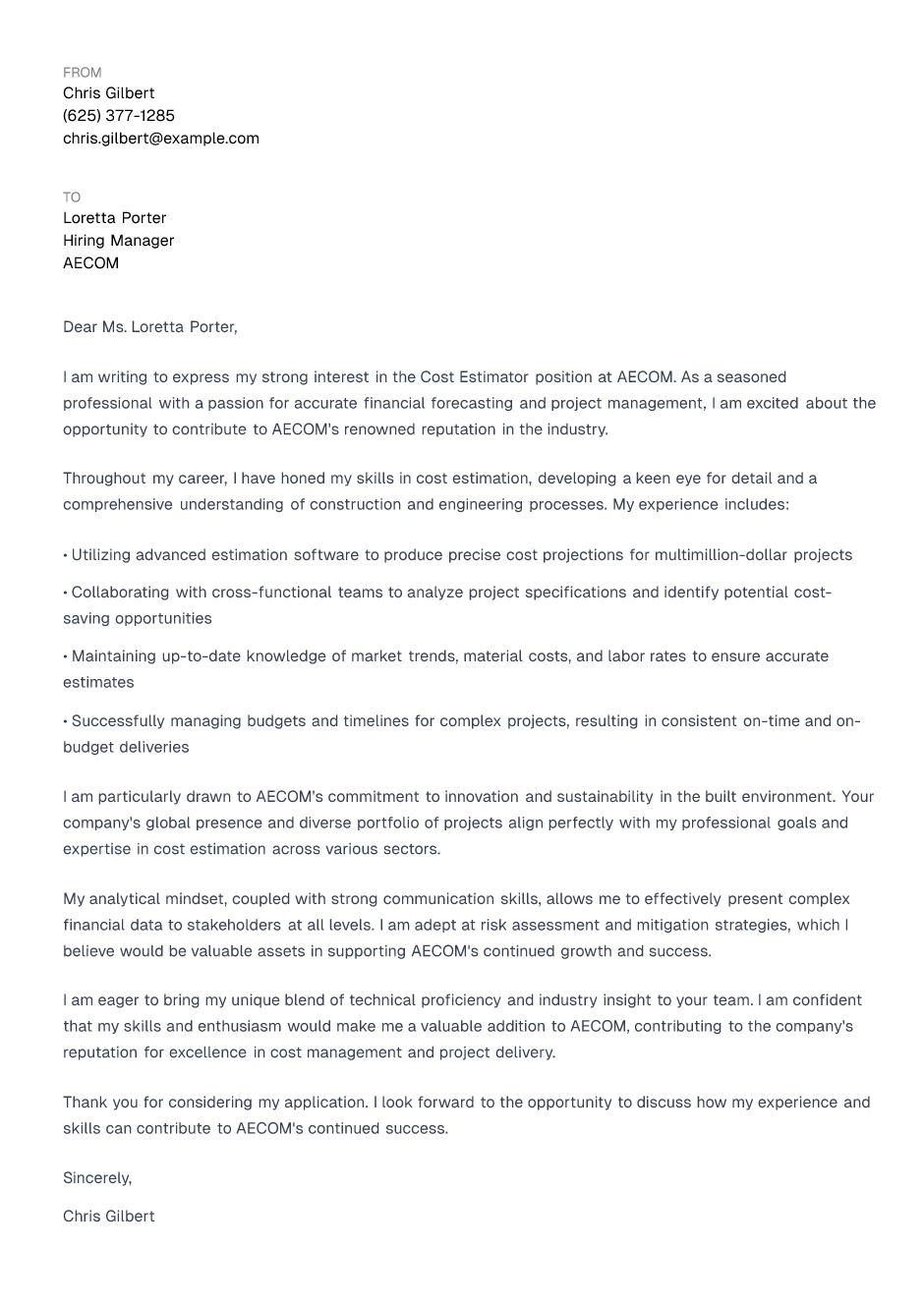 Cost Estimator Cover Letter Example