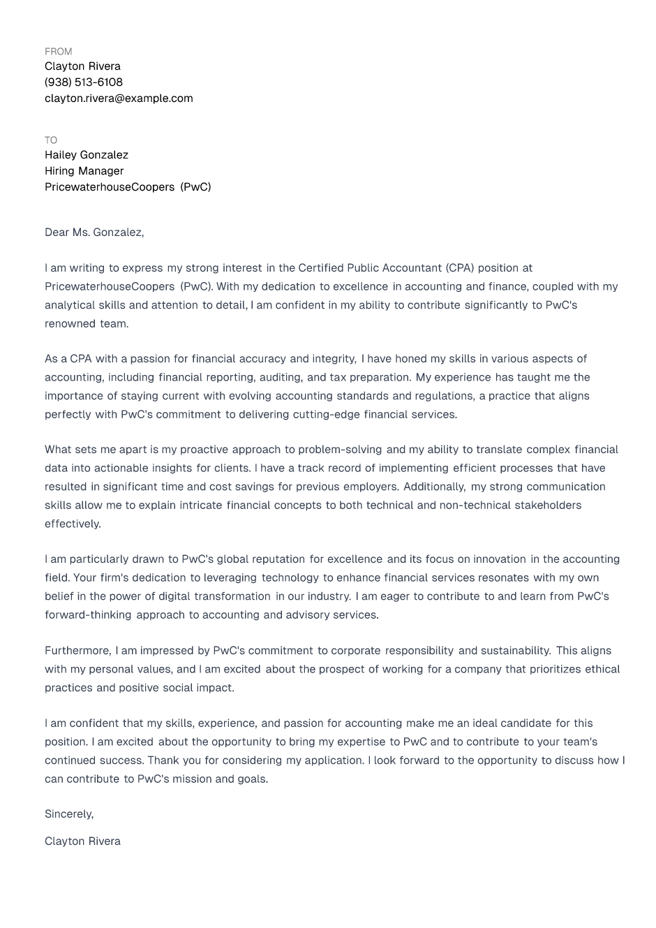 I am writing to express my strong interest in the Certified Public Accountant (CPA) position at PricewaterhouseCoopers (PwC). With my dedication to excellence in accounting and finance, coupled with my analytical skills and attention to detail, I am confident in my ability to contribute significantly to PwC's renowned team.