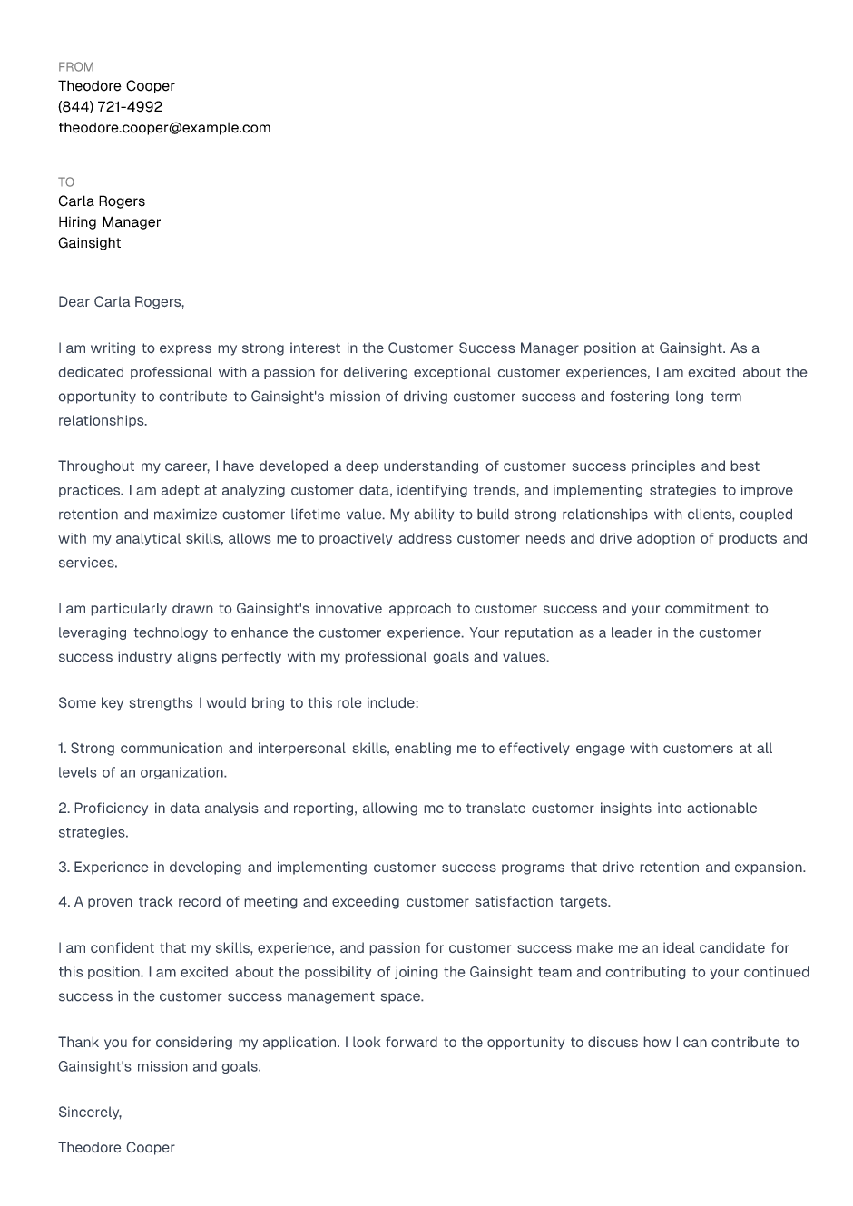 I am confident that my skills, experience, and passion for customer success make me an ideal candidate for this position. I am excited about the possibility of joining the Gainsight team and contributing to your continued success in the customer success management space.