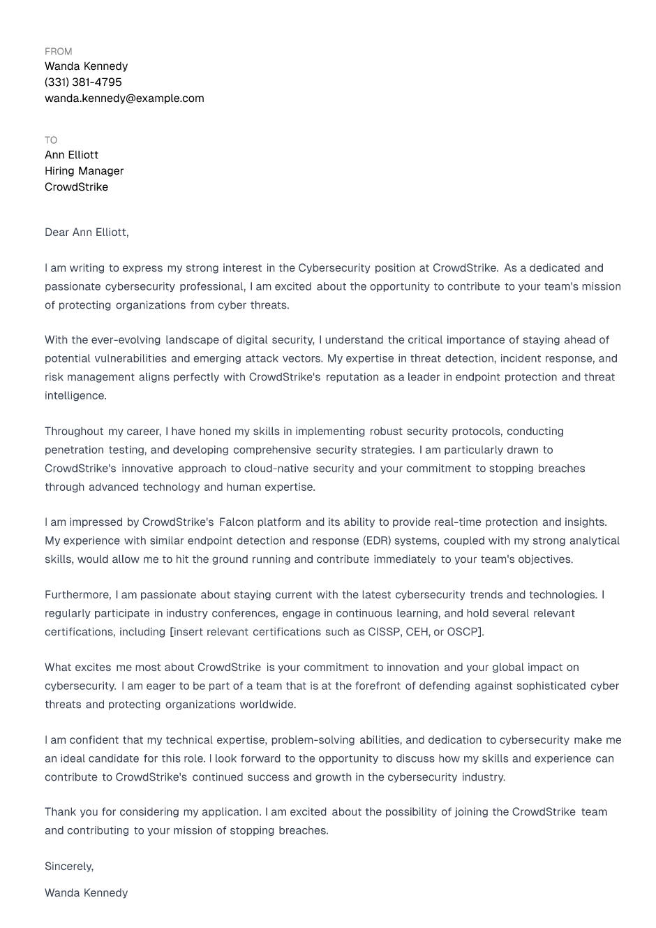 I am confident that my technical expertise, problem-solving abilities, and dedication to cybersecurity make me an ideal candidate for this role. I look forward to the opportunity to discuss how my skills and experience can contribute to CrowdStrike's continued success and growth in the cybersecurity industry.