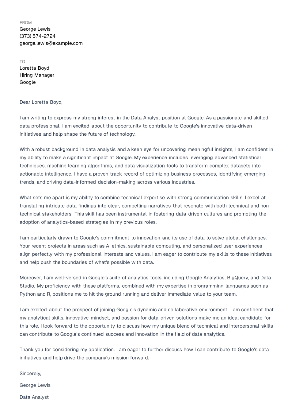 I am excited about the prospect of joining Google's dynamic and collaborative environment. I am confident that my analytical skills, innovative mindset, and passion for data-driven solutions make me an ideal candidate for this role. I look forward to the opportunity to discuss how my unique blend of technical and interpersonal skills can contribute to Google's continued success and innovation in the field of data analytics.