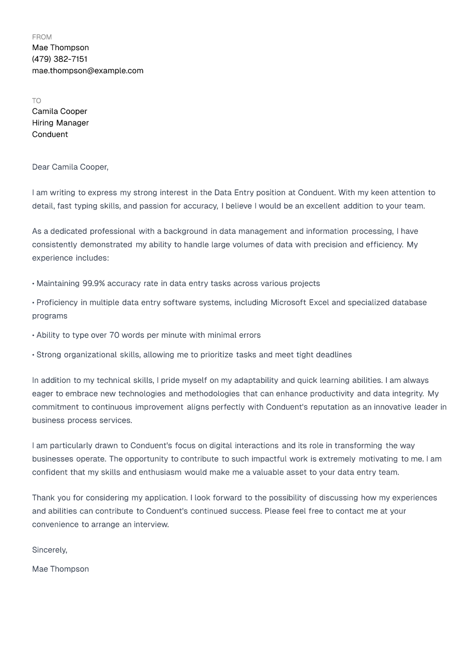 I am writing to express my strong interest in the Data Entry position at Conduent. With my keen attention to detail, fast typing skills, and passion for accuracy, I believe I would be an excellent addition to your team.
