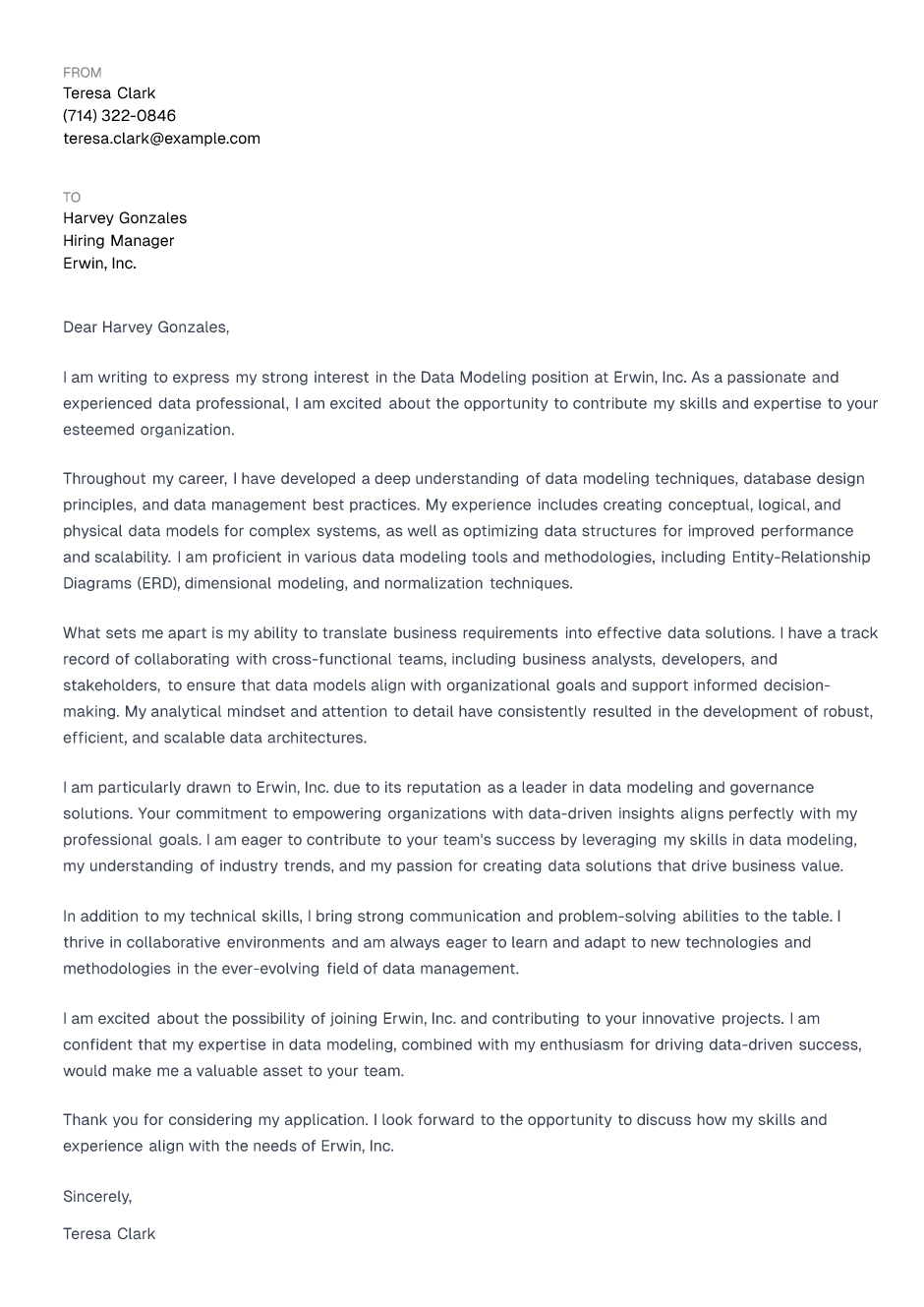 I am excited about the possibility of joining Erwin, Inc. and contributing to your innovative projects. I am confident that my expertise in data modeling, combined with my enthusiasm for driving data-driven success, would make me a valuable asset to your team.