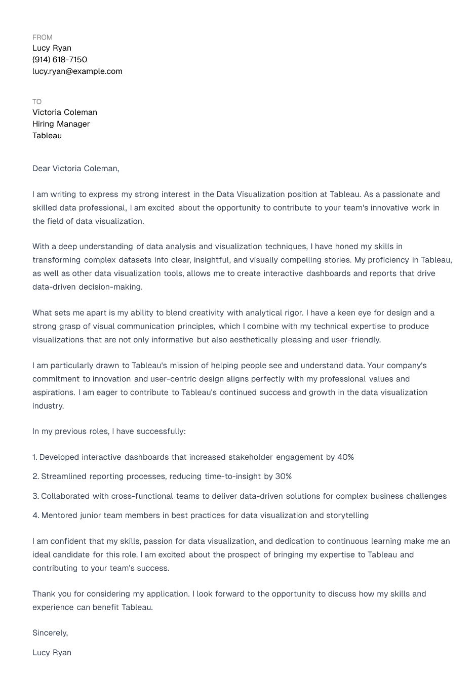 Discover how to write an effective data visualization cover letter using practical tips and an example. This guide helps you showcase your skills, highlight your experience, and make a strong impression on hiring managers. Equip yourself with the know-how to enhance your job application with a standout cover letter.