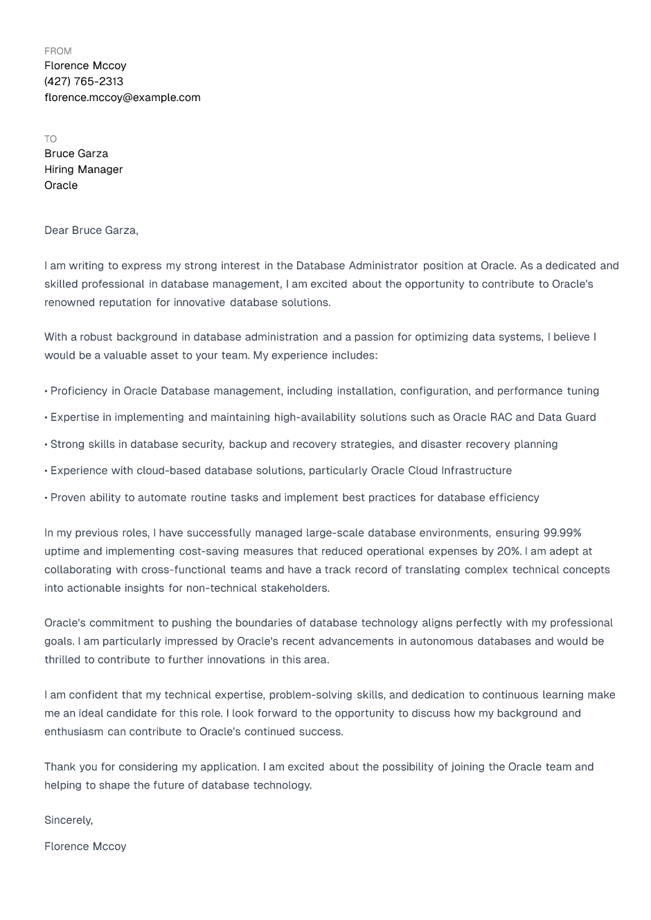 Remember, a good cover letter is short but powerful. It should make the person reading it want to learn more about you and invite you for an interview. Let's get started on how to make your database administrator cover letter the best it can be.