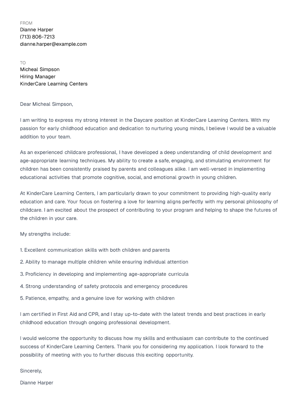 Remember to keep each paragraph focused and concise, using specific examples to illustrate your points. The body of your cover letter should convince the reader that you are not only qualified but also genuinely excited about the opportunity to contribute to their daycare.