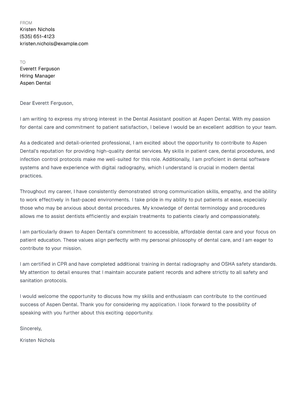 I am writing to express my strong interest in the Dental Assistant position at Aspen Dental. With my passion for dental care and commitment to patient satisfaction, I believe I would be an excellent addition to your team.
