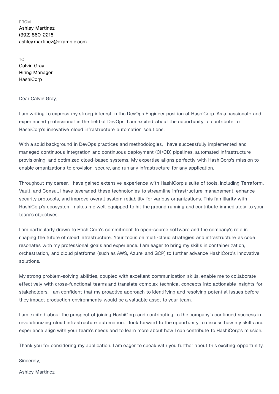 I am particularly drawn to HashiCorp's commitment to open-source software and the company's role in shaping the future of cloud infrastructure. Your focus on multi-cloud strategies and infrastructure as code resonates with my professional goals and experience. I am eager to bring my skills in containerization, orchestration, and cloud platforms (such as AWS, Azure, and GCP) to further advance HashiCorp's innovative solutions.