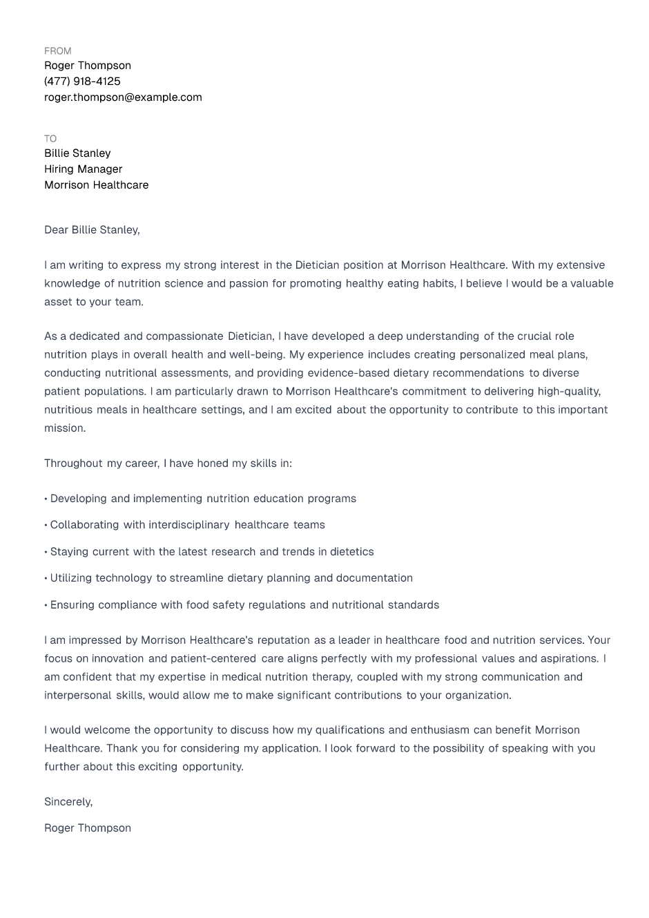 A cover letter lets you talk about your skills and experience in a way that your resume can't. It's where you can explain why you want the job and how your skills match what the employer needs. For dieticians, this might mean talking about your knowledge of nutrition, your experience working with patients, or any special training you have.