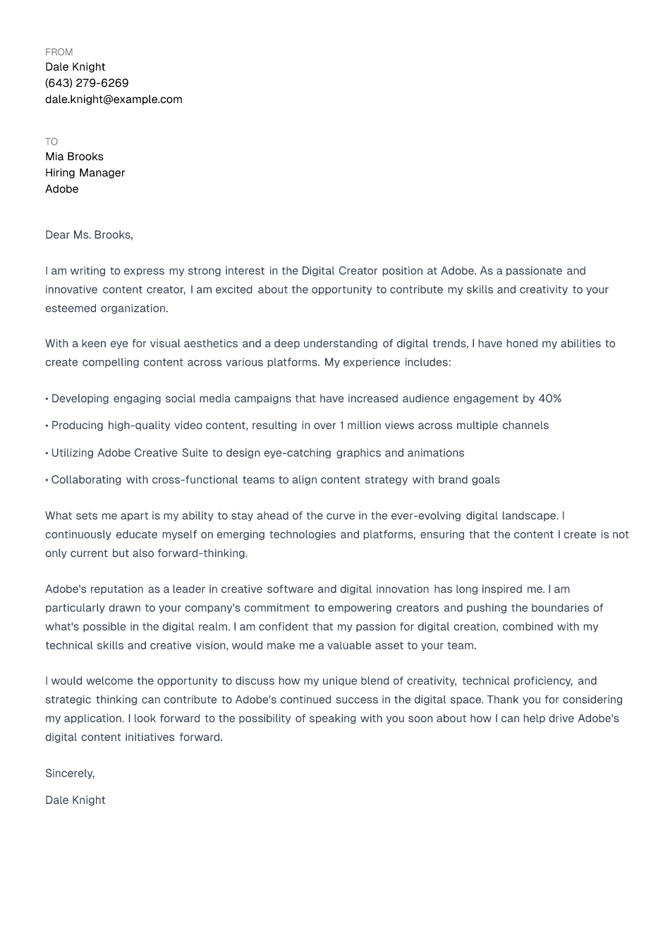 I would welcome the opportunity to discuss how my unique blend of creativity, technical proficiency, and strategic thinking can contribute to Adobe's continued success in the digital space. Thank you for considering my application. I look forward to the possibility of speaking with you soon about how I can help drive Adobe's digital content initiatives forward.