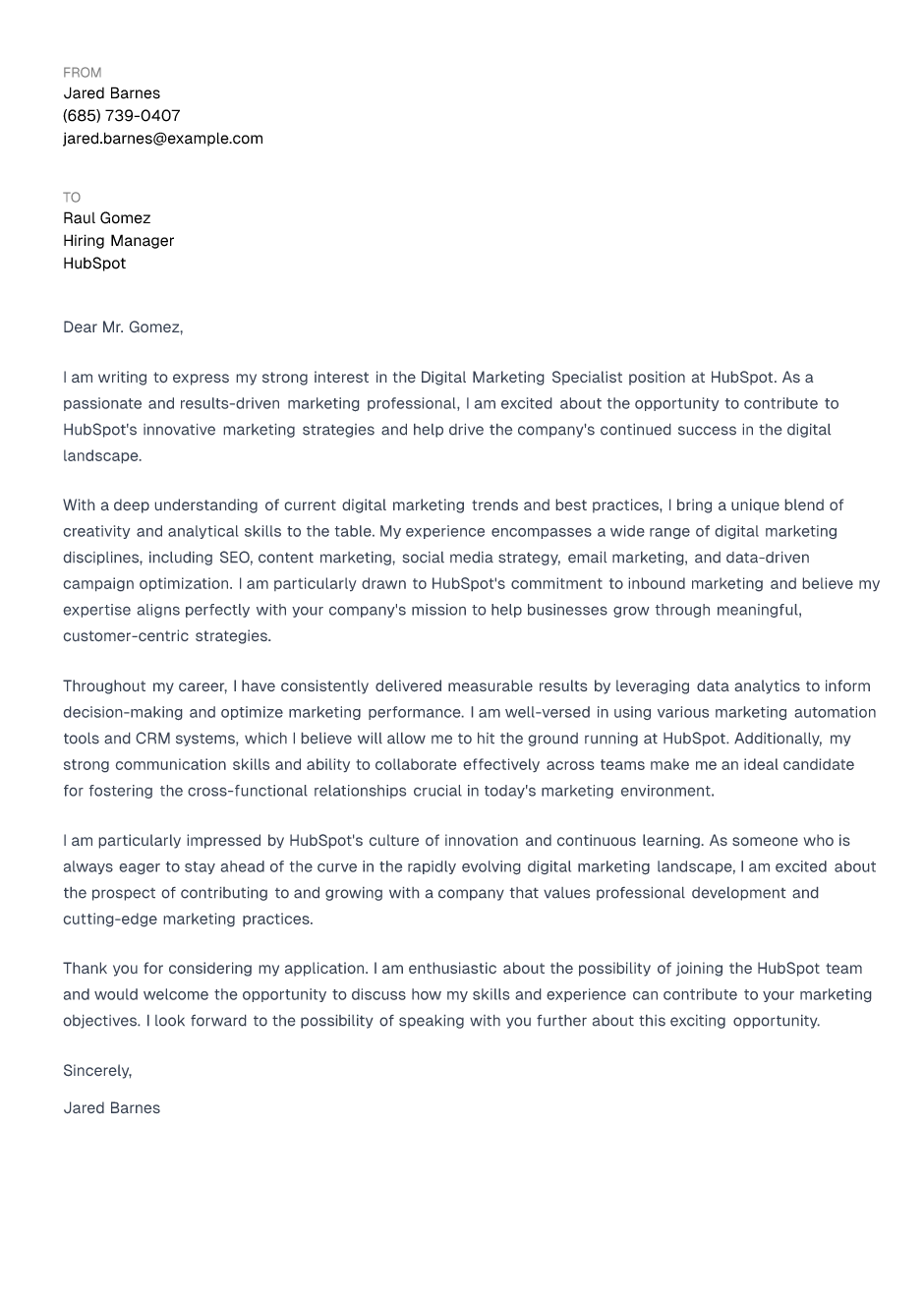 Thank you for considering my application. I am enthusiastic about the possibility of joining the HubSpot team and would welcome the opportunity to discuss how my skills and experience can contribute to your marketing objectives. I look forward to the possibility of speaking with you further about this exciting opportunity.