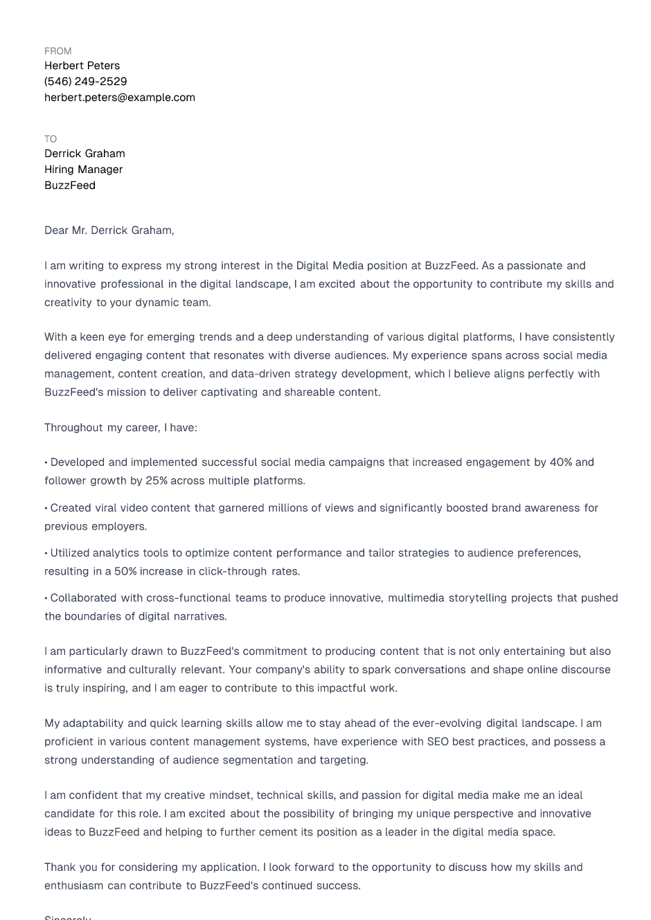 By crafting a clear, professional header, you set the stage for a compelling cover letter that showcases your digital media expertise and enthusiasm for the role.