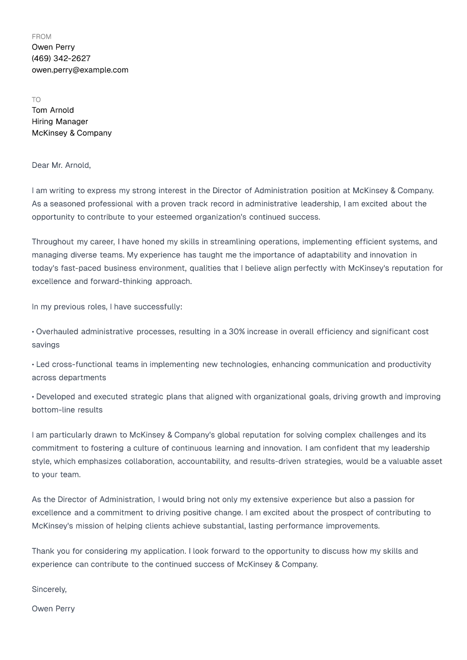 I am writing to express my strong interest in the Director of Administration position at McKinsey & Company. As a seasoned professional with a proven track record in administrative leadership, I am excited about the opportunity to contribute to your esteemed organization's continued success.