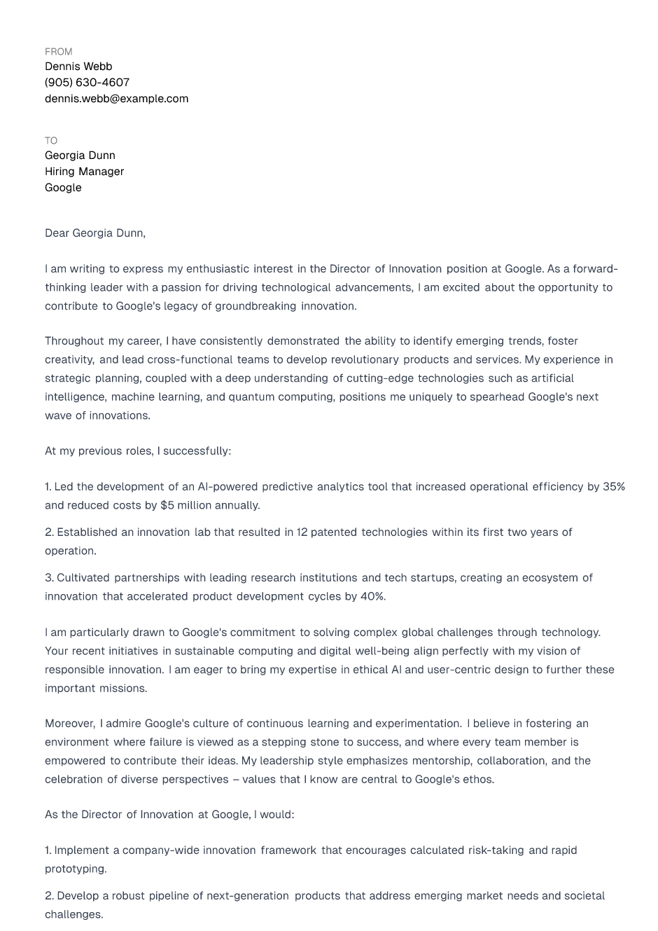 I am writing to express my enthusiastic interest in the Director of Innovation position at Google. As a forward-thinking leader with a passion for driving technological advancements, I am excited about the opportunity to contribute to Google's legacy of groundbreaking innovation.