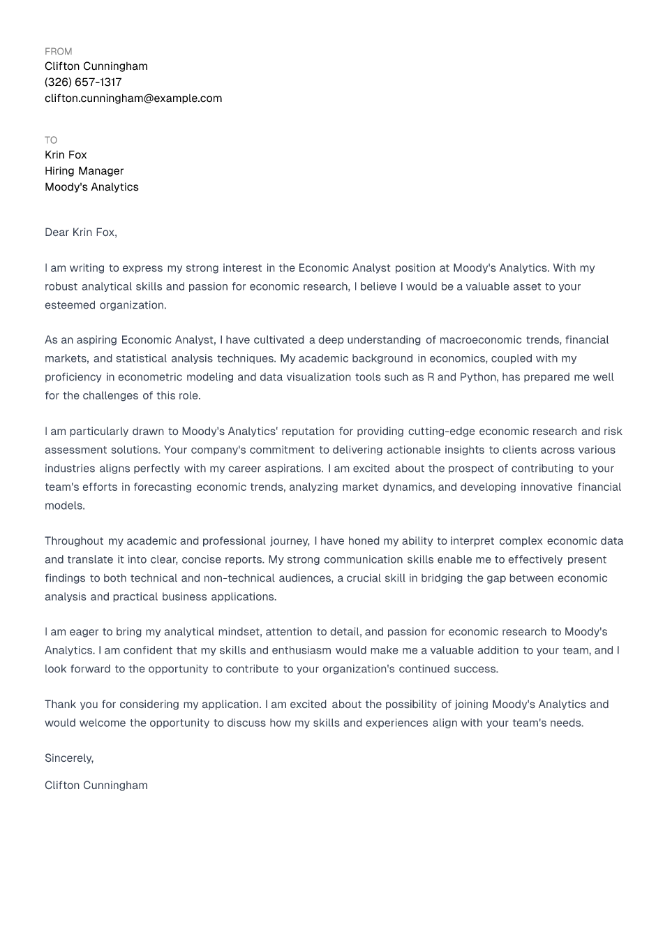 I am eager to bring my analytical mindset, attention to detail, and passion for economic research to Moody's Analytics. I am confident that my skills and enthusiasm would make me a valuable addition to your team, and I look forward to the opportunity to contribute to your organization's continued success.
