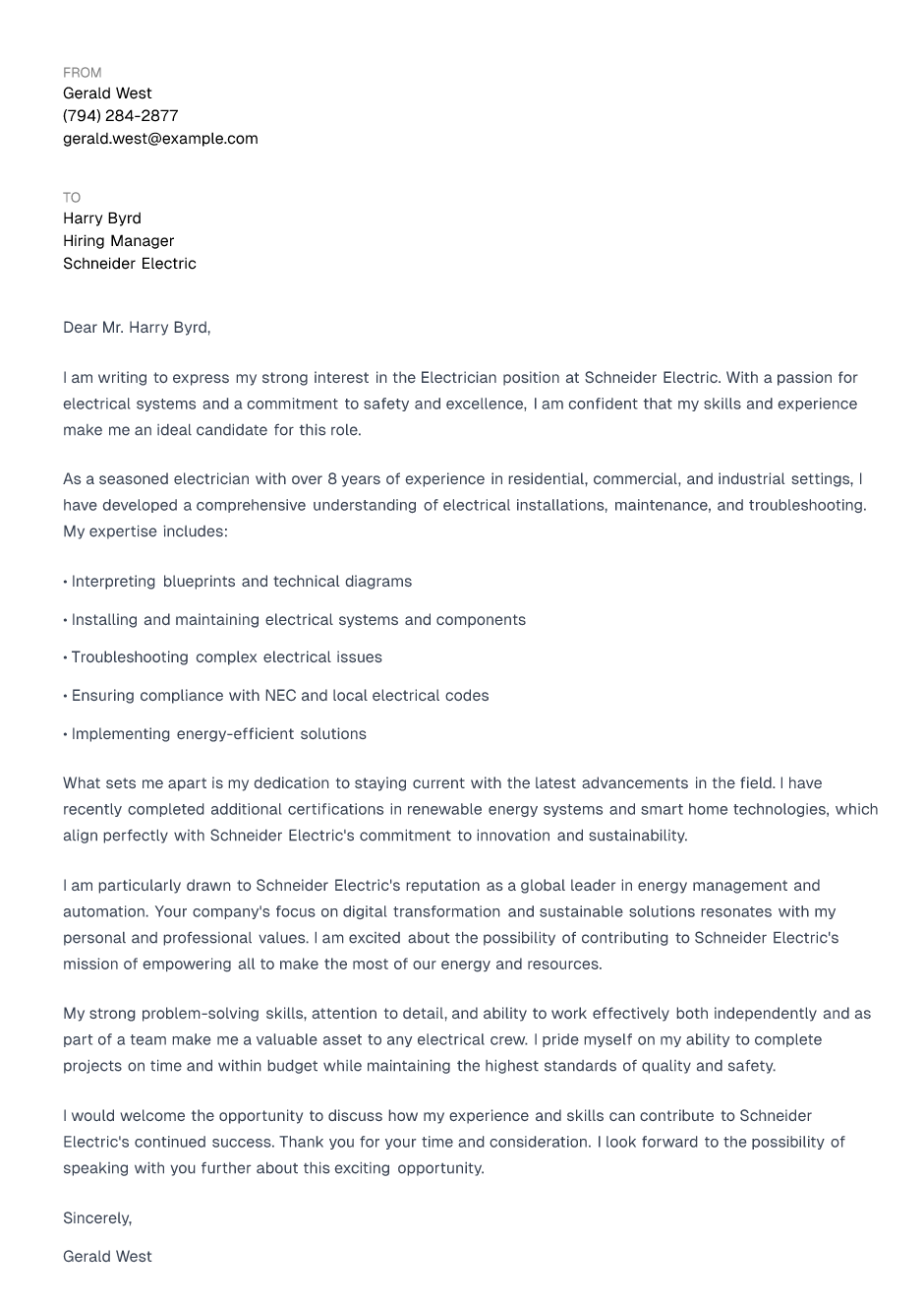 Electrician Cover Letter Example
