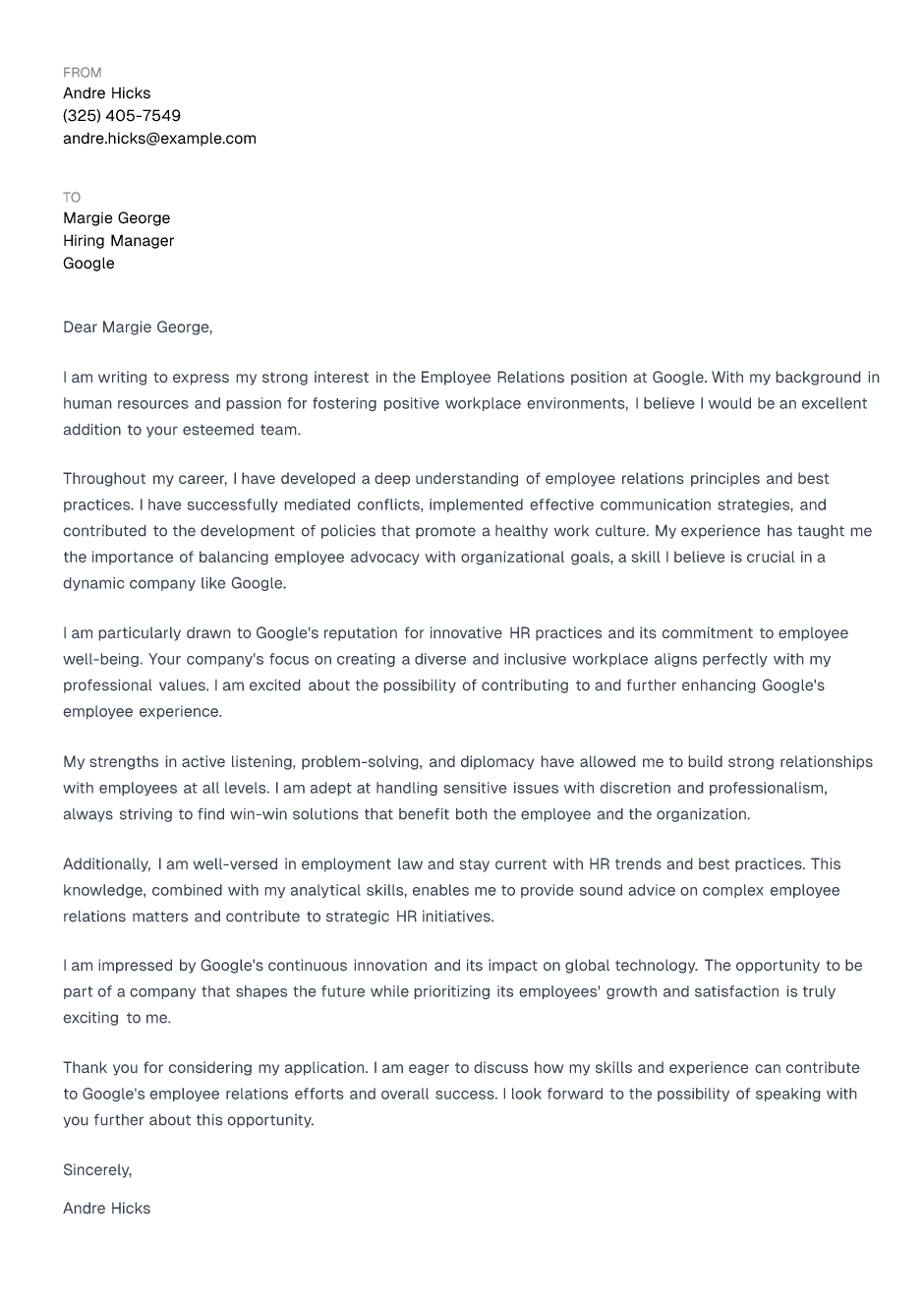Thank you for considering my application. I am eager to discuss how my skills and experience can contribute to Google's employee relations efforts and overall success. I look forward to the possibility of speaking with you further about this opportunity.