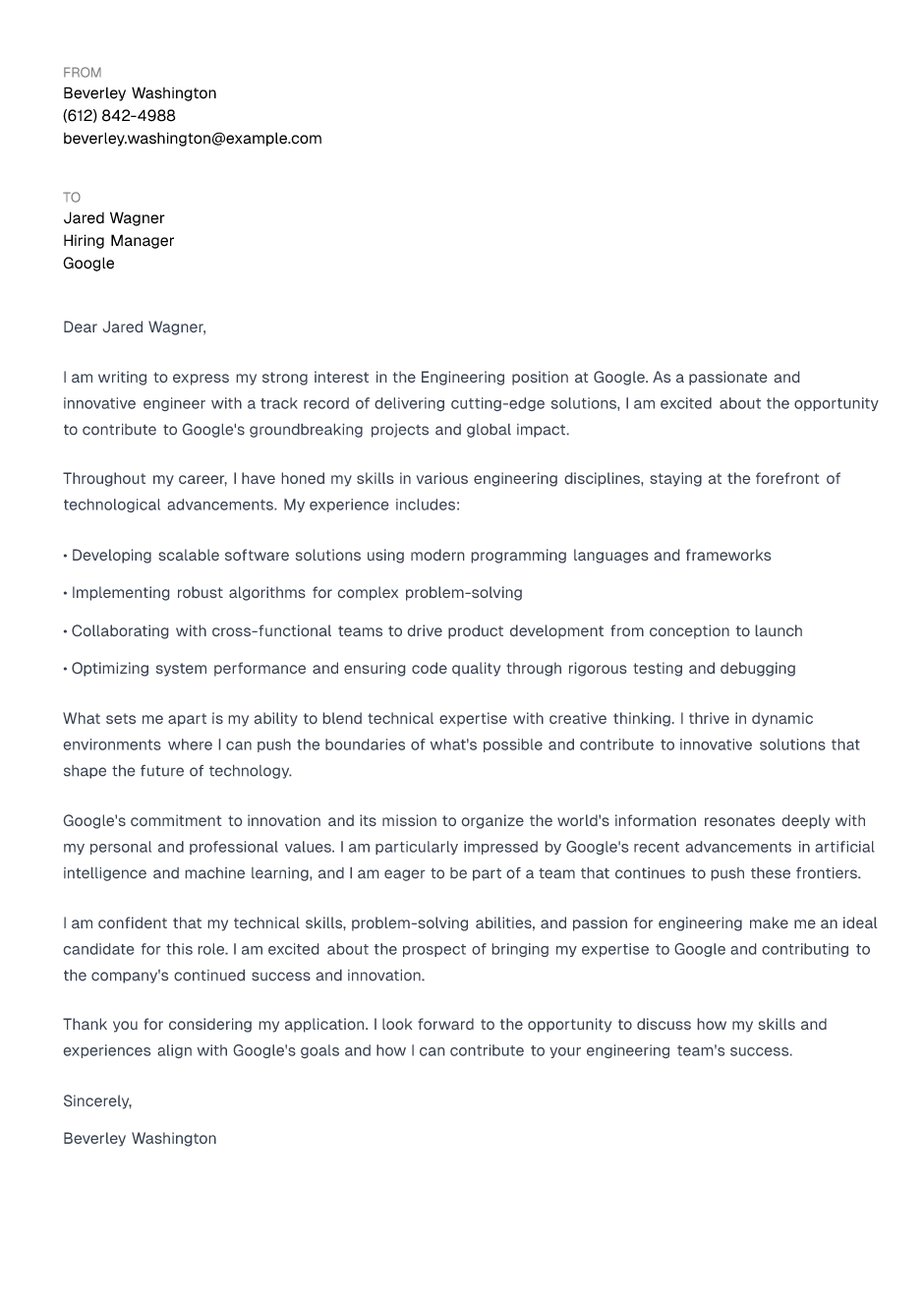 I am writing to express my strong interest in the Engineering position at Google. As a passionate and innovative engineer with a track record of delivering cutting-edge solutions, I am excited about the opportunity to contribute to Google's groundbreaking projects and global impact.