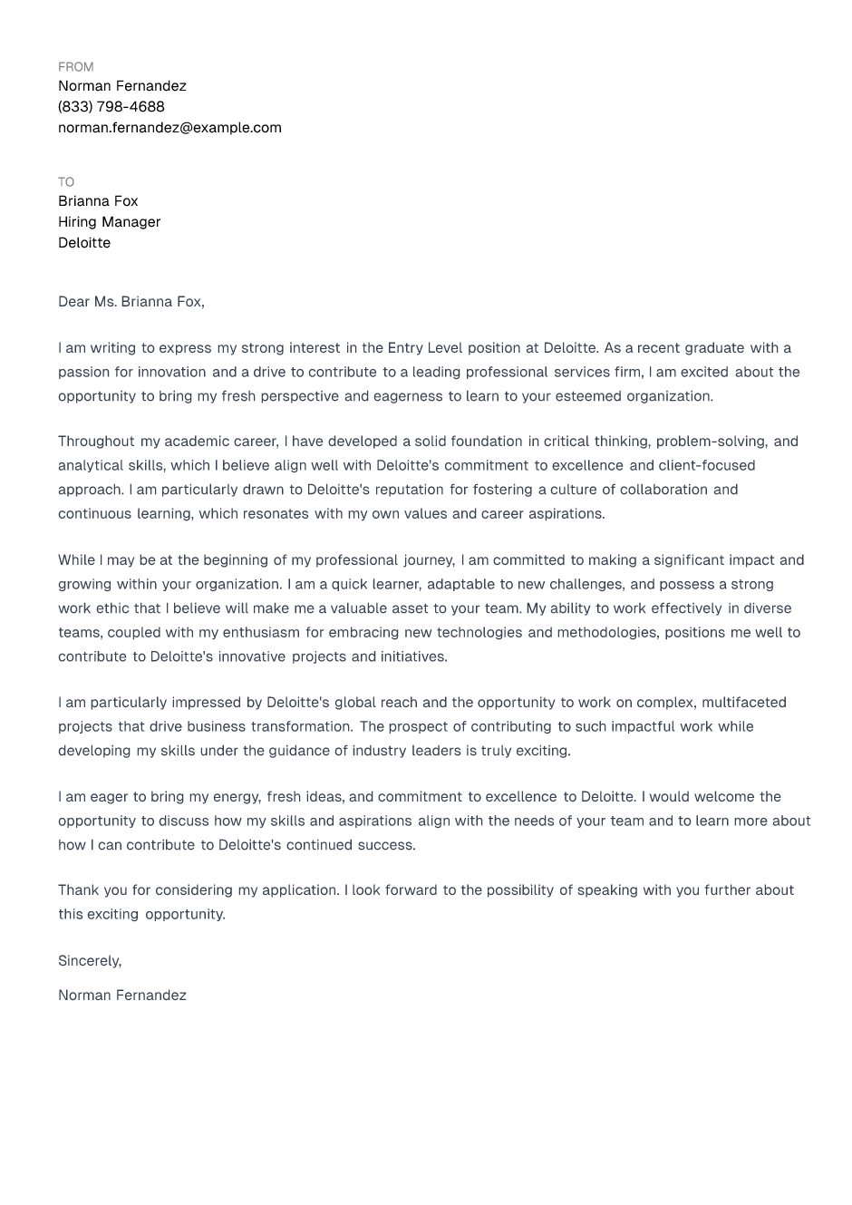 I am writing to express my strong interest in the Entry Level position at Deloitte. As a recent graduate with a passion for innovation and a drive to contribute to a leading professional services firm, I am excited about the opportunity to bring my fresh perspective and eagerness to learn to your esteemed organization.