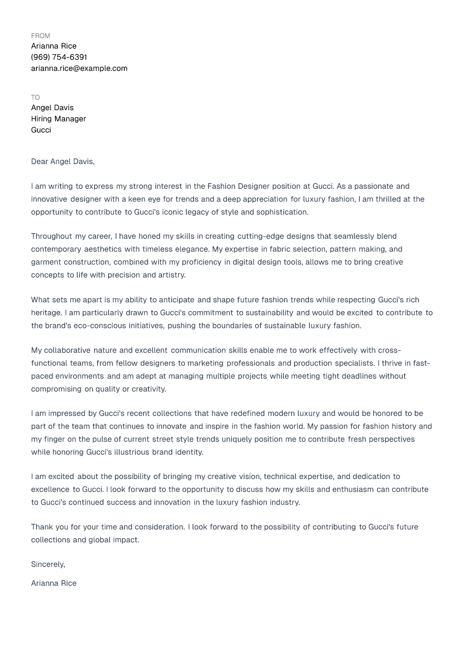 Fashion Designer Cover Letter Example