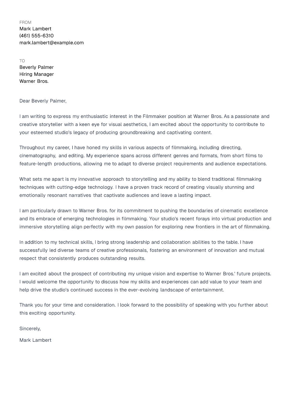 I am writing to express my enthusiastic interest in the Filmmaker position at Warner Bros. As a passionate and creative storyteller with a keen eye for visual aesthetics, I am excited about the opportunity to contribute to your esteemed studio's legacy of producing groundbreaking and captivating content.
