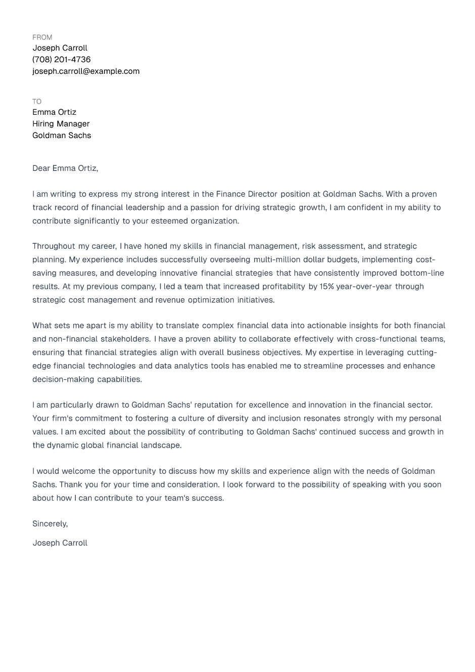 A well-written cover letter can help you stand out from other people who want the job. It gives you a chance to talk about your best qualities and show why you're the right person for the Finance Director position. In your letter, you can highlight your past successes, your knowledge of finance, and your ability to lead teams.