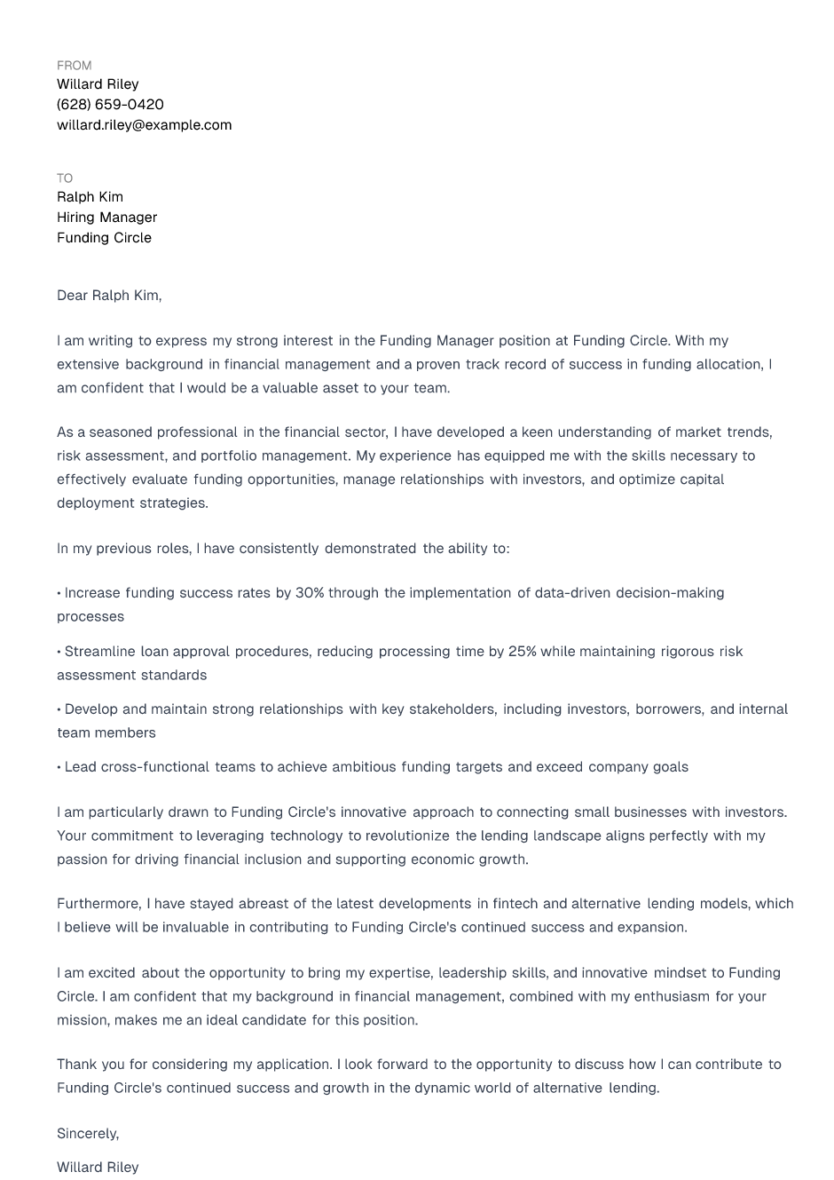 A funding manager cover letter should highlight your skills in handling money, working with numbers, and making smart financial choices. It's also a place to show your communication skills and your understanding of the company you're applying to.